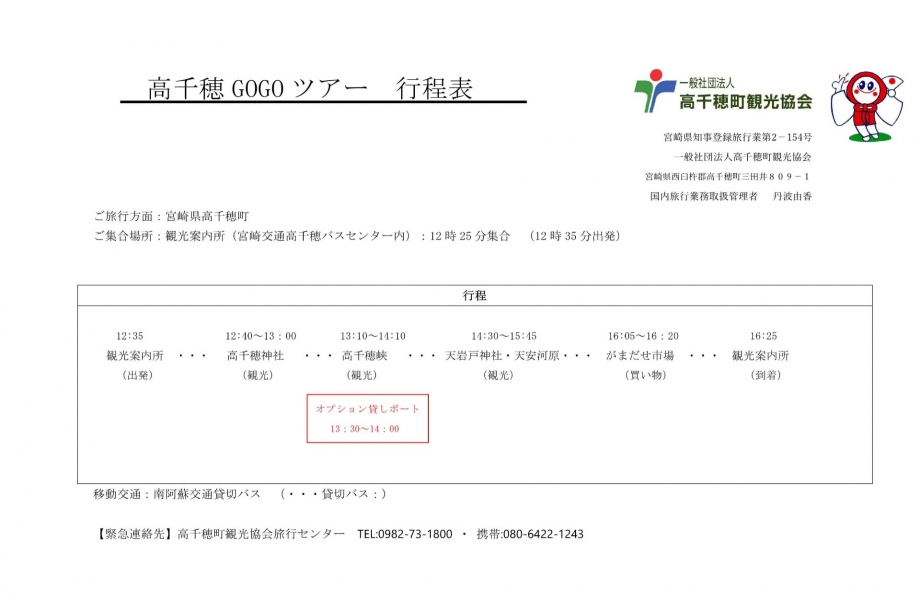 | 延岡方面へのバスの乗車を予定されている方へ | ツアーの終了時間は、16時25分を予定しています。 公共交通機関でお越しの方で16時25発のバスで延岡方面のバスの乗車を希望される方は、16時に観光案内所で離団する事ができますので、お申込み時にお知らせ下さい。 |