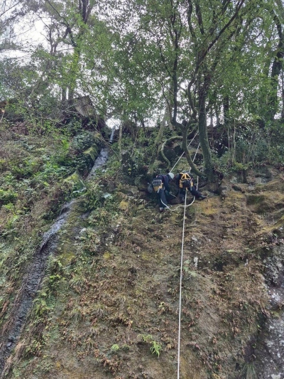 写真を見ての通り、まさに断崖絶壁。私たち観光協会スタッフや専門の作業員がロープー本で崖を降り、岩の隙間をひとつひとつ丁寧に計測しています。