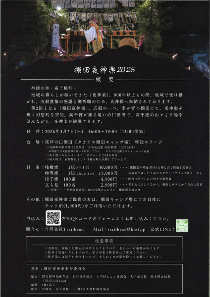 | その他 | 棚田夜神楽ご鑑賞の方は、棚田キャンプ場にて当日夜にテント泊(1,000円)をご利用いただけます。 |