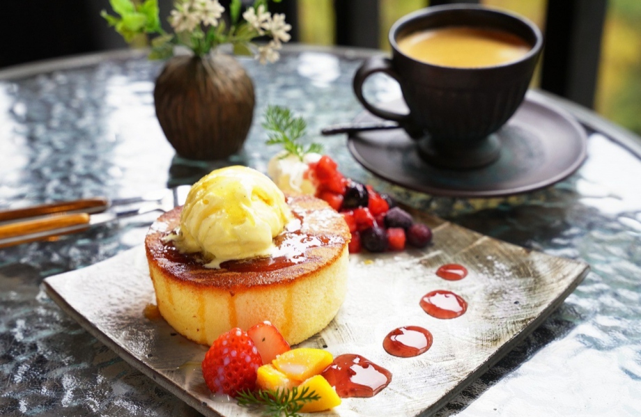 豊富な種類のソフトクリームやドリンク、「高千穂牛ドッグ」、「パンケーキ」などを楽しみながら、天岩戸の渓谷を眺める事ができるテラス席でゆっくりと過ごすことができます。