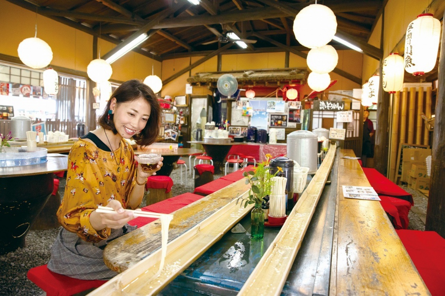 昔からのスタイルを貫く老舗。4本の竹の樋(とい)を横たわらせ、高千穂峡の玉垂の滝の清流を引いて流すそうめん。昭和30年、当時の新聞各社の支局員が屋外でそうめんを湯がき、高千穂峡の冷水にさらして食べ、涼を得たという事を記事しました。その新聞記事を見た千穂の家社長が、試行錯誤の末に「そうめん流し」のスタイルを生み出したといわれています。