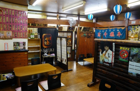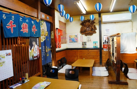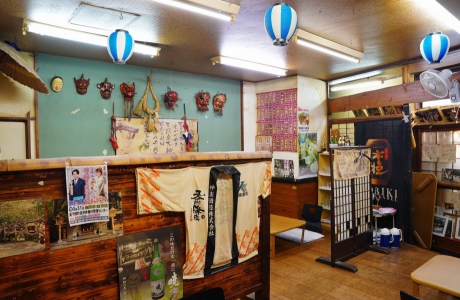 高千穂中心街のシンボルにもなっている大きな二つの神楽面が目印の「居酒屋けんちゃん」内装もとても賑やかで、そこにいるだけで元気がもらえる場所です。