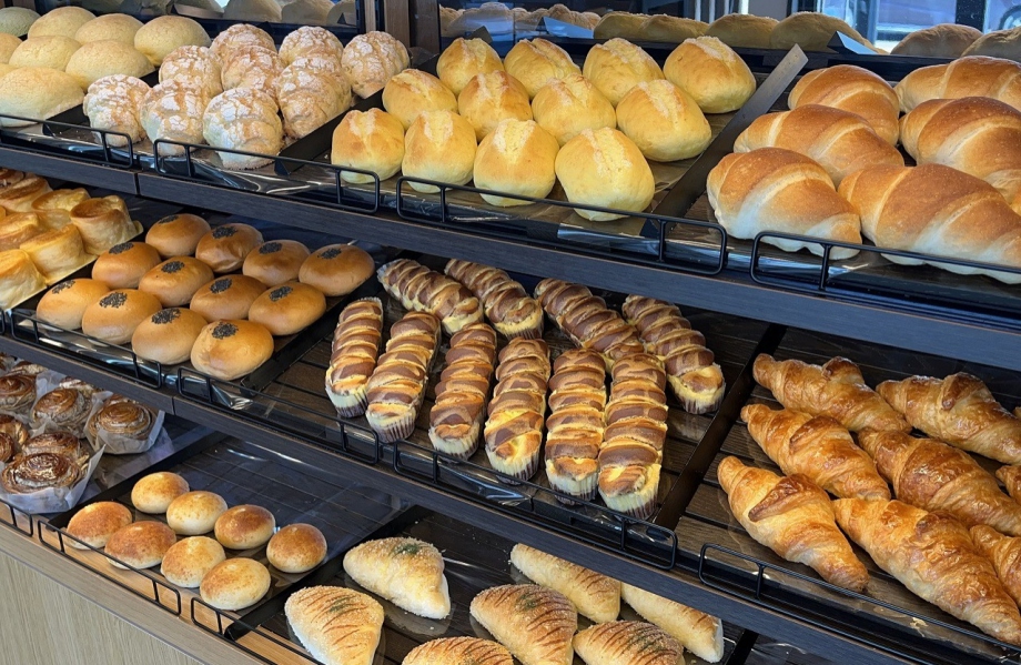 豊富な種類のパンが並び、焼きたてのパンを味わうこともできます。