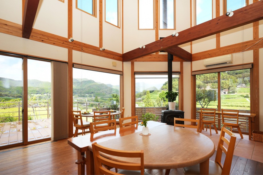 店内の大きな窓から、棚田や高千穂の山々を見ることができ、自然を感じながらゆっくりランチを楽しむことができます。