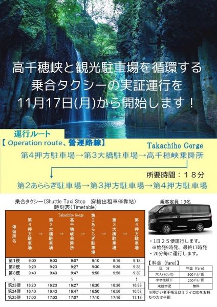 高千穂峡と観光駐車場を循環する「乗合タクシー」の実証運行を11/17(月曜日)、午前9時から開始します。
